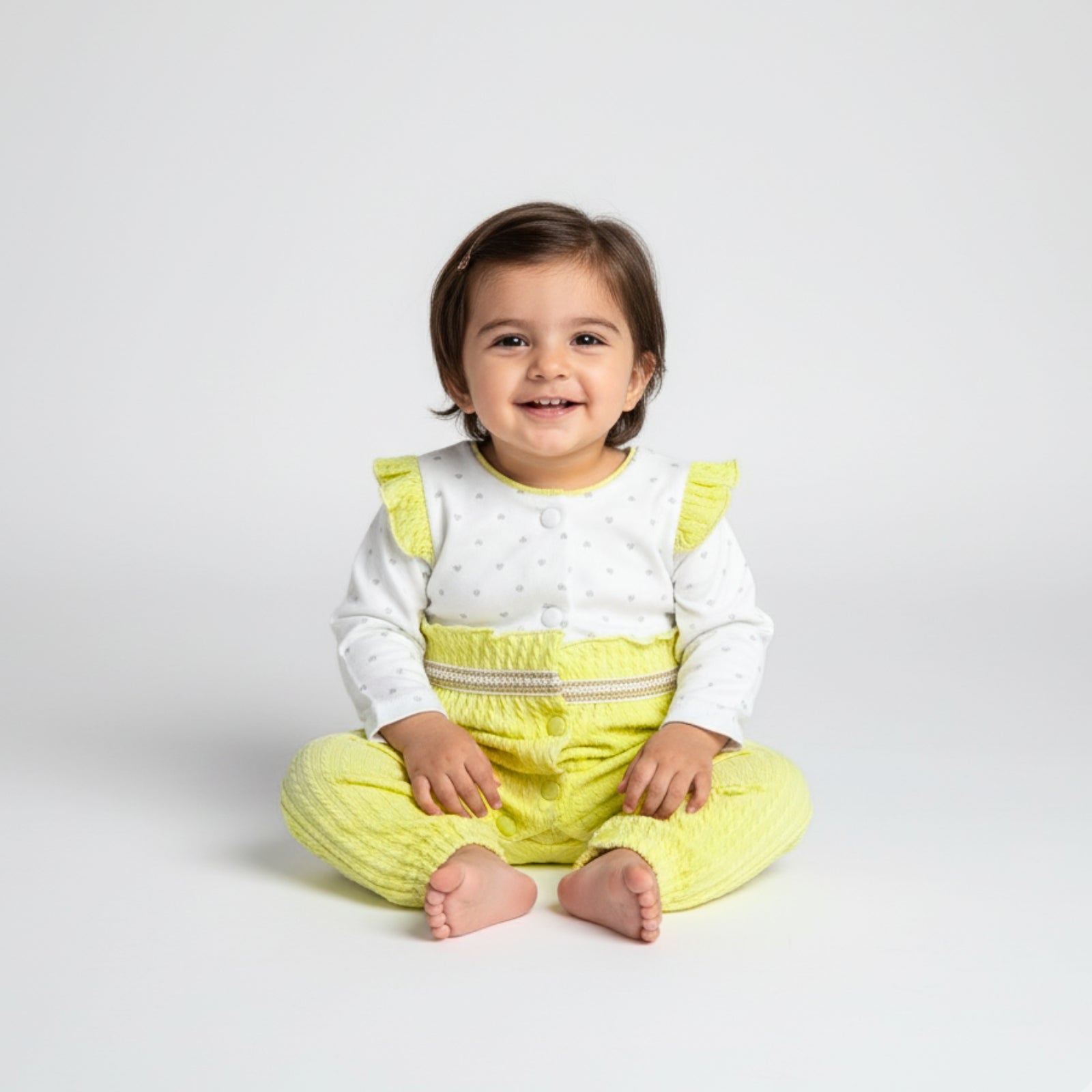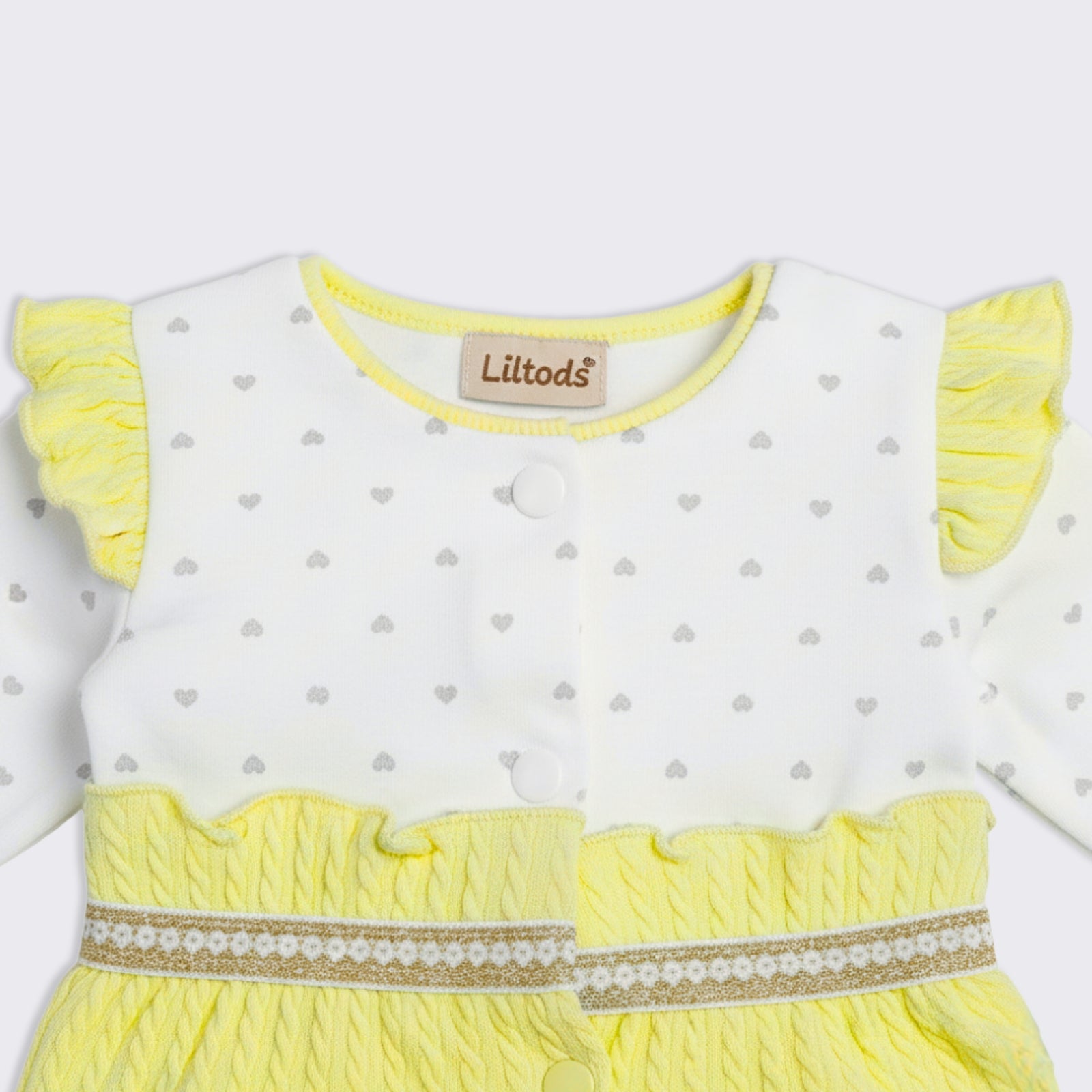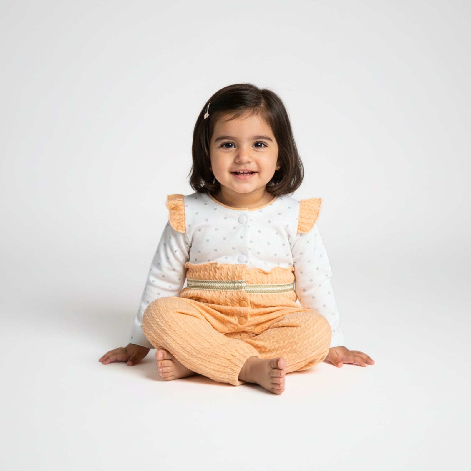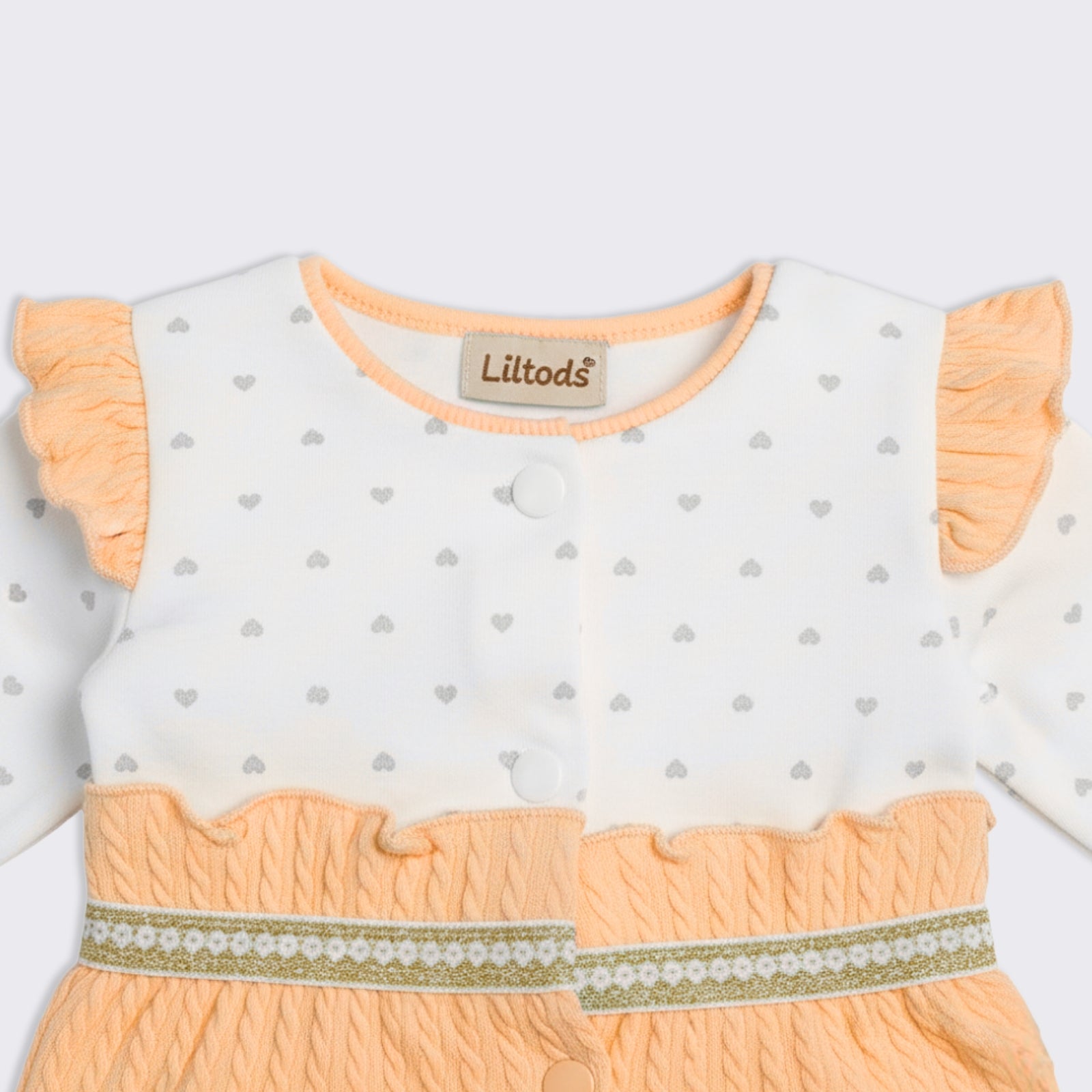 This charming romper features a soft heart-patterned top paired with a textured bottom, giving the look of a layered outfit in one easy piece. Designed with snap buttons for quick changes and a comfy fit, it keeps your little one cozy and irresistibly adorable all day long.